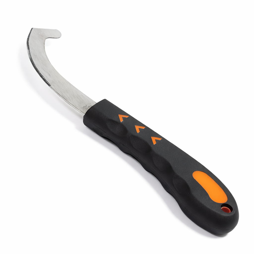 A curved metal knife with plastic handle for removing bot eggs from horses