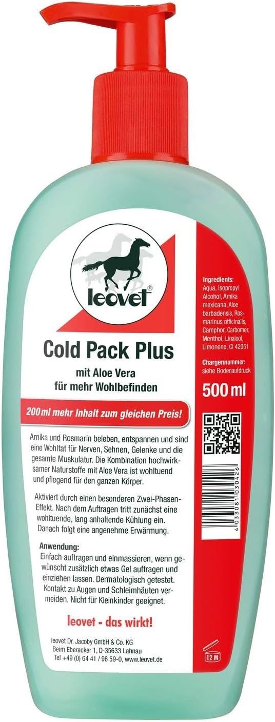 For enhanced well-being for your horse after strenuous legwork. It works in a two-fold fashion first by providing a refreshing cool-down effect then with a soothing and deep penetrating heat. Arnica, Camphor and Rosemary both stimulate and relax nerves, tendons and joints. Menthol and frankincense resin relax and rejuvenate benefiting the whole musculature The highly effective combination of natural substances with Aloe Vera soothes and cares for the entire body. It improves mobility and supports blood circulation even when stabled. Used without bandages it heals and soothes while nourishing the skin. Recommended to stop use 48-60 hours before competing.